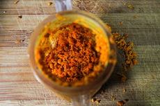 Como ejemplos podemos citar los ensayos realizados en el presente trabajo. La preparación del tinte es clave para continuar con el teñido, por lo que, para la Cúrcuma (4) y el Ají (12) es necesario triturar de manera (5,6,7) que al momento de mezclar el tinte natural con el agua, ésta adquiera el color del elemento natural utilizado (8). Para elaborar el tinte con Tocte (10) es recomendable dejarlo en remojo con suficiente agua por dos semanas hasta que el color de la nuez tinture de marrón oscuro el líquido (11).